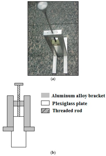 (a) Pouring the mixture into the mould; (b) setting the tool on the mould, vertically adjusting the glass plate by rotating the threaded rod and horizontally removing the tool, so that the glass plate could ‘flatten’ the mixture; (c) the mixture was paved flatly in the mould.