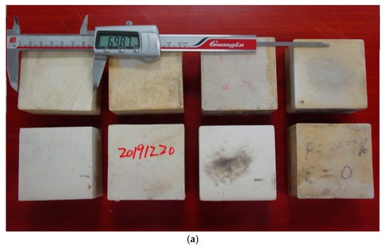In order to produce artificial rocks with the same fracture densities but different porosities, we made the following modifications to the method of Ding (2014) [,]: (1) Different amounts of mineral material mixture were layered in the mould (70 mm × 70 mm) in 37 layers when building the different porosity samples. (2) The mixture of different samples was compressed into the same thickness (50 ± 0.3 mm) by adjusting the applied pressure to form blocks of the same volume. Therefore, the blocks that were made using more mixture would experience higher loading pressure and would have lower porosity. (3) A total of 126 touch paper discs were spread on the surface of each layer (except the top layer) in all the blocks. Fracture density is unitless and is calculated using the following formula: