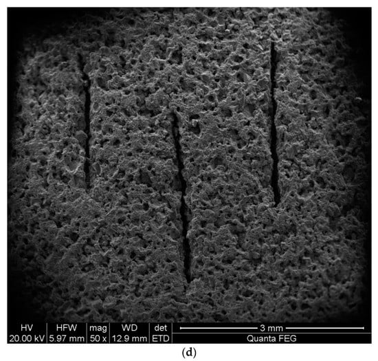 Four groups of artificial rocks with different porosities were constructed (Figure 3a). Each group consisted of two samples (one fractured sample containing penny shaped fractures with a fracture density of 0.06 and a corresponding unfractured sample). The fracture diameter was set at 3 mm and the fracture thickness was 0.06 mm. Table 1 lists the main parameters of all the samples. The porosity was measured using helium porosimetry. In the fractured samples, the fracture porosity was calculated to be 0.75%, but the porosity difference between the fractured and blank (unfractured) samples within each group varied from 0.4% to 1.5% larger or smaller than the fracture porosity, indicating a small difference in background porosity between the fractured and blank samples. This was caused by tiny errors in the manufacturing process. A section obtained by cutting a fractured sample is shown in Figure 3b, where parallelly distributed fractures can be observed. A scanning electron microscope (SEM) image of the section is shown in Figure 3c,d, where pore and fracture structures with controlled geometry are clearly shown.