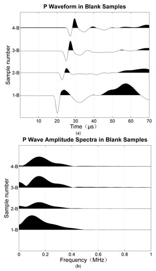 where and are fast and slow shear wave velocities. The numerical modelling experiment of wave propagation in anisotropic media by Dellinger and Vernik (1994) showed that if the wave front was propagating parallel or perpendicular to the layering (or in this case, to the fractures) [], a true phase velocity was measured in laboratory ultrasonic experiments. Therefore, in this study, P- and S-wave phase velocities were measured in both parallel and perpendicular directions. The transmitted signals of the blank samples were analysed using Fourier transform to obtain the dominant frequency and to calculate the wavelength (Figure 4). The ratio of wavelength to fracture diameter (λ/d ratio) was between 5.2 and 10.8 for the P wave and between 3.9 and 12 for the S wave. Based on experimental and numerical studies [], for this λ/d ratio, both the P and S wave may exhibit Rayleigh scattering. This is undesirable because the equivalent medium criteria are violated. This problem has been frequently encountered in previous experimental studies [,]. However, similar to previous studies, we also found some interesting correlations between the experimental results and theoretical predictions.