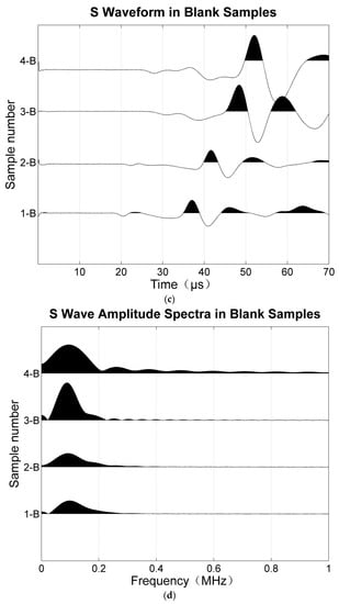 P and S waveforms and the amplitude spectra of blank samples. (a) P waveform, (b) P-wave amplitude spectrum, (c) S waveform, and (d) S-wave amplitude spectrum.