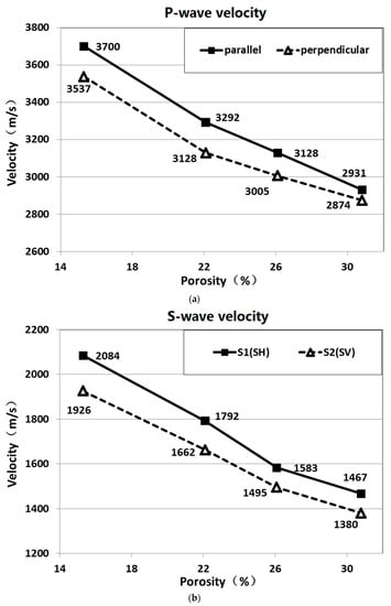 Figure 5 shows the measured P- and S-wave velocities in the water-saturated fractured samples. Significant velocity anisotropy was evident in all the fractured samples, with the faster P-wave being measured parallel and the slower one perpendicular. The measured velocity anisotropy is discussed further in the following paragraphs. When the porosity increased from 15.3% to 22.1%, the P-wave velocities (both parallel and perpendicular) dropped sharply. However, as the porosity continued to increase, the decreasing trend in the perpendicular direction was slower than that in the parallel direction, narrowing the difference between the parallel and perpendicular directions and indicating a decrease in anisotropy. However, when porosity increased from 15.1% to 30.8%, the decrease observed in both S1 and S2 wave velocities was generally similar.
