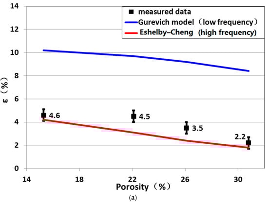 The inputs for equivalent medium theories are given in Table 1 and Table 3. The Eshelby–Cheng theory (high frequency) predicted P-wave anisotropy to be close to the measured results [,]. Although the expressions of the Eshelby–Cheng theory do not contain background porosity, its predicted P-wave anisotropy showed a decreasing trend with increasing background porosity. The Eshelby–Cheng theory is expressed by Equations (1) and (2). Note that in Equation (1), refers to the fracture-occupied porosity, not the background porosity, and in all the fractured samples, the fracture porosities are practically identical. The predicted P-wave anisotropy fluctuations were mainly dominated by parameter in Equation (2), which relates the applied strain to the “stress-free” strain of the inclusion. is expressed as follows: