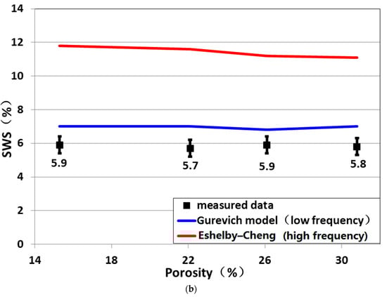 In the theoretical predictions of [], with increasing porosity, P-wave anisotropy showed a decreasing trend, whereas SWS remained practically constant. This trend was similar to the measured results. However, the theoretical predictions were higher than the measured results. For water-saturated conditions, the theoretically predicted P-wave anisotropy of [] was as follows: