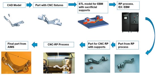 Additive System Integrated Subtractive (AIMS) systems are the combination of Electron Beam Melting (EBM) and Computer Numerically Controlled Rapid Prototyping (CNC-RP) (Figure 2). The AIMS method is used for metallic components, such as the Ti-6Al-4V alloy, in which the tolerances and surface finishes are improved by digital machining post-EBM-AM. The comparative studies between the CNC-RP technique and the AIMS method revealed that the AIMS method is faster, with an estimated buy-to-fly ratio of less than 3. On the other hand, the CNC-RP process has a buy-to-fly ratio greater than 13. The buy-to-fly ratio is the measure of the efficiency of raw material use. It gives the weight ratio of the raw material to the final product [27].