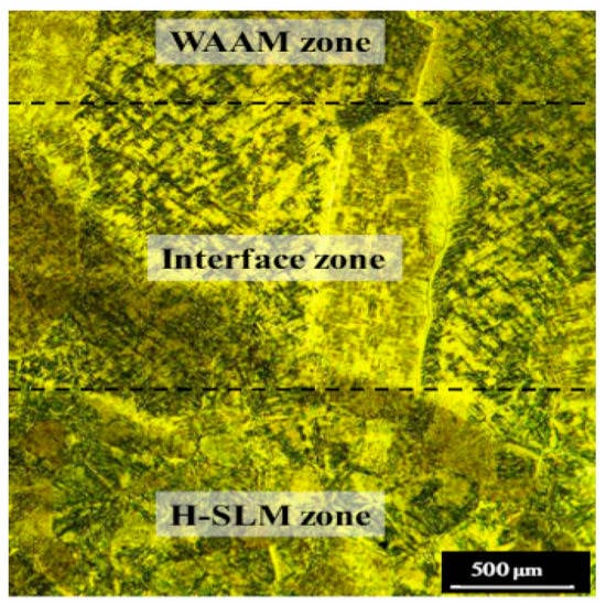 Shi et al. [41] explored the feasibility of fusing the SLM and WAAM processes using the Ti-6Al-4V alloy. The SLM process has the advantages of generating fine surfaces and high-density components with good mechanical properties and geometrical flexibility. However, the process has high production costs associated with low building rates and small-scale production [42,43]. On the other hand, WAAM has a high deposition rate and production volume, but it has limited geometrical accuracy and poor surface quality. The synergy of these two processes was implemented to take advantage of each process’s capability, simultaneously limiting their constraints. The SLM-produced component was set as the substrate and was partitioned into two sections, namely the complicated and simple sections. The complicated section’s fabrication was SLM processed, and the rest of the simple section was completed using WAAM. To prevent potential defect formation and maintain a high bonding strength at the interface, the SLM process was employed as the substrate-processing technique. This choice aimed to mitigate the risks associated with defect formation and ensure robust bonding at the interface. From Figure 5, the joining of the AM processes has three zones, the SLM zone, interface zone, and WAAM zones, with an interface of about 3 mm. Each zone appears to have a distinct microstructure. The SLM zone primarily produced short β columnar grains consisting mainly of a martensitic structure. Subsequently, a complex interface with coarse grains caused by repeated heating, facilitating grain growth. The martensite formation is most likely due to high cooling rates from above the β-transit temperature of Ti-alloys. Furthermore, the progression into the WAAM zone revealed an α lamella with evident epitaxial growth. It was found that the WAAM build sections had inferior mechanical properties (yield strength: 1020 MPa, tensile strength: 1098 MPa, and elongation: 10.2%) compared to the SLM section (yield strength: 814 MPa, tensile strength: 927 MPa, and elongation: 10.5%). To confirm the effects of these varied mechanical properties, further testing was conducted on the hybrid parts parallel to the building direction, and failure was observed in the WAAM section with a yield strength of 890 MPa and a tensile strength of 905 MPa. Sections perpendicular to the build direction were evaluated to expand the applicability of this approach; however, it had low mechanical properties (yield strength: 850 MPa, tensile strength: 995 MPa). It was evident that the strength of the hybrid was higher compared to the WAAM component, despite being lower than the SLM component. Thus, the advantages of the combined processes can be realized. In this work, a sound metallurgical bond was achieved with no identifiable defects; however, no heat treatment of the produced hybrid material was performed, which could have optimized the mechanical properties of the alloy [41].
