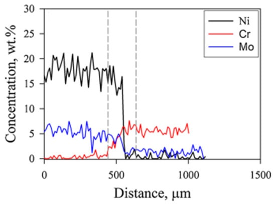 Minor alterations to an alloy’s prescribed composition or thermal history significantly alter its performance and properties, such as resilience, toughness, and resistance to corrosion. Homogeneity in the microstructure is crucial for joint strength for dissimilar metals, as shown in a study by Aziz et al. [34]. Due to chemical and microstructural inhomogeneity, a hybrid built from MS1 and a wrought H-13 maraging steel substrate fractured at the interface. Porosity also contributed to the failure, as reported in the study. A solute variation of alloying elements was observed at the interface transition. The chemical composition changed abruptly from Ni, Mo, and Co-based MS1 to H-13, which is Cr-based. (Figure 6). Chromium diffused through the interface into the MS1 section [34].