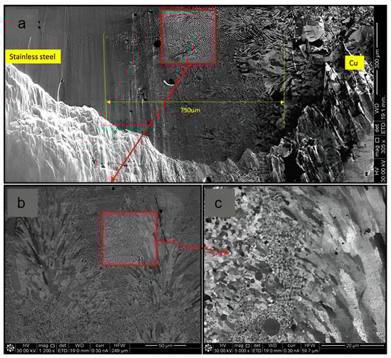 Liu et al. [53] applied the direct joining technique on a 316/C18400 alloy using LPBF. Cracks were observed on the stainless steel section close to the interface because the highly conducting Cu diffused into the austenite grain boundaries, resulting in thermal stress inside the matrix. Fused Ion Beam imaging (FIB) revealed an intermix region, approximately 750 µm in length, with a mixture of fine-grained structures (Figure 8). Inadequate melting caused substantial porosity in the Cu alloy (Figure 8c). This was most likely due to Cu’s high reflectivity and heat conductivity at a 300 W laser power. The copper alloy was melted directly on top of the stainless steel, and a large quantity of copper was presumably present in the melt pool, causing micro-cracks to occur during cooling [53].