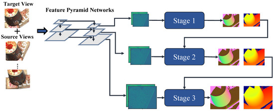 Figure 1 displays the comprehensive architecture of the neighborhood normal vector cues-based multi-view stereo network. As with other techniques, our approach utilizes a multi-scale feature pyramid network to acquire multi-scale feature information from images captured through different viewpoints. The information entering the network is N image information from varying viewpoints, represented as , where signifies the target image, while pertains to the source images obtained from the surrounding viewpoints. In addition to this, as input, we require the intrinsic matrix and extrinsic matrix of each image, which can be calculated via the Structure From Motion (SFM) methodology. Our network model has three stages, as indicated in Figure 1, and the feature map dimensions used in each stage are , , and , correspondingly. The generated feature maps are then fed into the stereo-matching module at each stage, culminating in the development of higher-resolution depth prediction outcomes through iterative means.