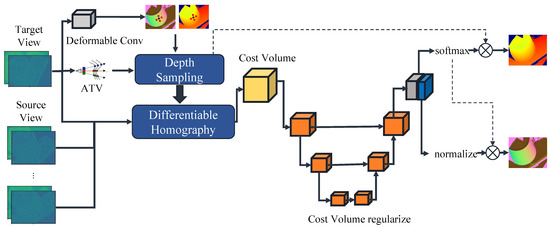 In 2018, Yao et al. [13] proposed the MVSNet algorithm, which represents the first end-to-end multi-view stereo network model that applies deep learning to estimate depth. The core of the network is a differentiable homography module that creates a matching cost volume through mapping source images to target images via depth sampling. The cost volume undergoes regularization and soft argmax to produce the final depth map. Subsequent improvements concentrate on two primary aspects.