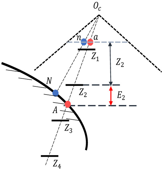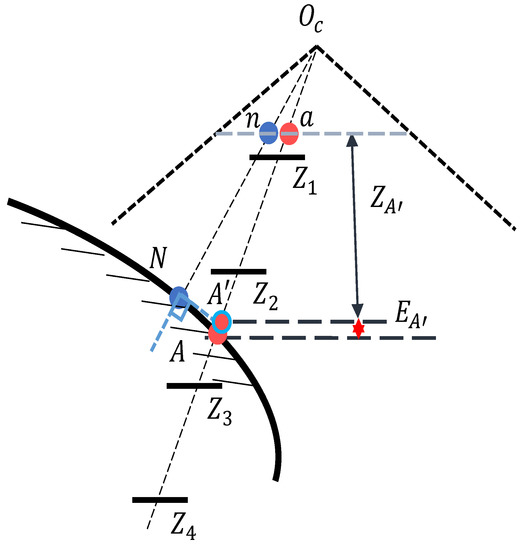 Sampling based on neighborhood tangent plane information propagation: represent four hypothetical depth values after uniform sampling, represents the depth value of the point A’ lying on the tangent plane of the neighboring point N. The imaging result of N and A’ on the image plane is n and a. The error between the depth sampling value closest to point A and the true depth value of point A is . Identical sampling conditions serve to minimize the error between estimated and true values, thus contributing towards a more precise computation of the depth distribution.
