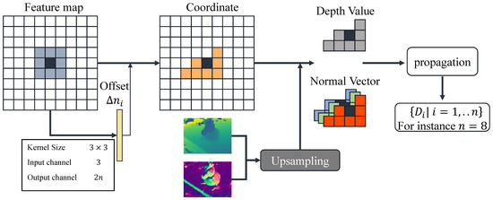 Owing to our deep sampling approach that is heavily reliant on the spatial disposition of neighboring pixels, and mandating the neighborhood pixels to maintain similar tangent planes to the current pixel in 3D space as shown in Figure 5, the algorithm necessitates the spatial surface of the neighboring points to remain contiguous with the current pixel to avoid any significant discrepancies between the sampling findings and the actual value. To tackle this challenge, we incorporated the reference image feature map information within the model. As shown in Figure 7, by leveraging deformable convolutional networks, we ascertained the position offset of the neighboring pixels and overlaid the original neighborhood pixels against said offset, thereby achieving a computation of spatially continuous neighborhood positions. This methodology facilitates a deep sampling procedure predicated on neighborhood tangent plane propagation.