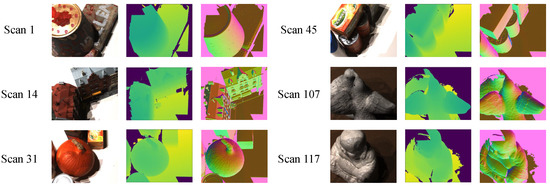 The DTU dataset [30], as shown in Figure 8, is an indoor small target multi-view stereo dataset proposed in 2016. The dataset was created by capturing several views of an object utilizing an industrial robot arm with adjustable brightness lights. Each view captured was comprehensively controlled to obtain camera intrinsic and extrinsic parameters. The dataset comprises 124 diverse scenes. Each scene includes 49 views, with each view containing seven distinct levels of brightness information. Therefore, there exists a total of 343 images per scene, all possessing an image resolution of . To enhance network training efficiency during the training phase, the dataset resolution was pruned to . Ultimately, the training set is comprised of 79 scenes consisting of a total of 27,097 images, alongside corresponding depth ground truth data. The validation set consists of 18 scenes incorporating 6174 images and corollary depth ground truth data, whilst the test set employs 22 scenes providing 7546 images in total complemented with corresponding depth ground truth information. In order to attain ground truth normal information, which will be utilized as supervised information for the normal estimation module, the k nearest neighbor points in the space based on the depth ground truth information were calculated, resulting in the derivation of 33,271 normal vector maps.