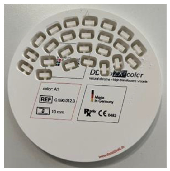 The zirconia sample (n = 72) dimensions 4 × 4 mm and 2 mm thickness were milled from pre-sintered zirconia blanks (DD Bio ZX2 color—High Translucent (3Y-TZP-LA, Dental Direkt, Dental Direkt GmbH, Spenge, Nordrhein Westfalen, Germany) (Figure 1) by using a 5-axis milling machine (K5, Vhf camfacture, Ammerbuch, Germany). We used burs in the CNC machine (Vhf camfacture, Ammerbuch, Germany), with burs types z200-r3d-40 (milling thickness 2 mm) and z100-r2d-40 (milling thickness 1 mm). The milling speed was 22,000–25,000 revolutions per minute (RPM). Then, the samples were sintered at 1450 °C for 2 h.