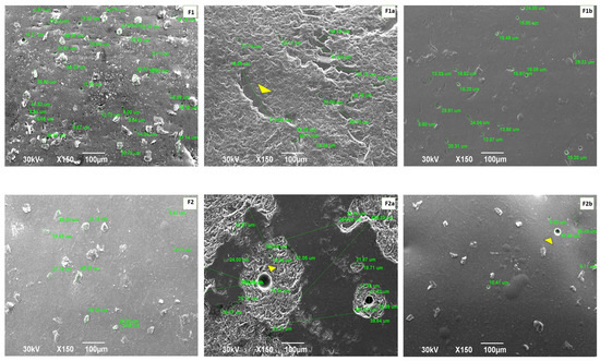 Veneered and polished zirconia samples (F1) had a slightly irregular surface, with microcracks and visible particles on the surface. Barely visible horizontal lines might indicate the direction of polishing. However, veneered and polished zirconia after ultrasonic scaling (F1a) showed an uneven surface with pores and grooves of various sizes, cavities and chipping-type defects, which average value was 55.59 µm (highlighted by yellow arrow). On the venneered zirconia samples treated with brushing (F1b), small surface defects and groovelike formations were evident (yellow arrow). On the contrary, venneered and glazed zirconia samples (F2) showed a relatively regular surface texture with whitish particles without voids. The veneered and glazed samples treated with ultrasonic scaling (F2a) showed the most surface irregularities in the form of large defects, with an average value of 88.31 µm. The layered breaking of the material was evident. On the sides of the defects (yellow arrow) remained a porous surface. On the surfaces of the veneered and glazed samples after brushing (F2b), there were visible protrusions and traces of scratches caused by brushing (yellow arrow). The entire surface was undulated with round-topped particules (Figure 2).