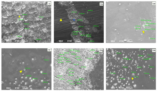 Figure 3 shows a SEM examination of the CAD/CAM milled zirconia samples. The CAD/CAM milled and polished zirconia samples (C1) revealed an eroded surface that was created by samples made using the manufacturer’s techniques and highlighted by a yellow arrow. These changes were in the forms of two types of traces, one coarser and the other finer. CAD/CAM milled and polished zirconia samples treated with ultrasonic scaling (C1a) showed a rough surface in the form of parallel scratches. Visible irregularities were those created by the effect of ultrasonic scaling (rougher, blue arrow) and others created by the effect of milling (mild, yellow arrow). As for the CAD/CAM milled and polished zirconia samples after brushing (C1b), there were slight traces, which were probably the result of the action of the brush (yellow arrow). CAD/CAM milled and glazed zirconia samples (C2) showed a slightly smoother surface layer with pale dimples and poured glaze drops (yellow arrow). On the surface of CAD/CAM milled and glazed zirconia after ultrasonic scaling (C2a), extreme irregularities in the forms of scratches and defects were visible, with a mean value of 45.38 µm. CAD/CAM milled and glazed zirconia samples after brushing (C2b) showed a porous surface with black and white holes. The black holes (blue arrow) had uneven bottoms and were not covered with glaze, as the glaze remained only on the edges. It could be assumed that the tip of the bristles of the brush and the applied abrasive polishing paste broke off parts of the glaze.