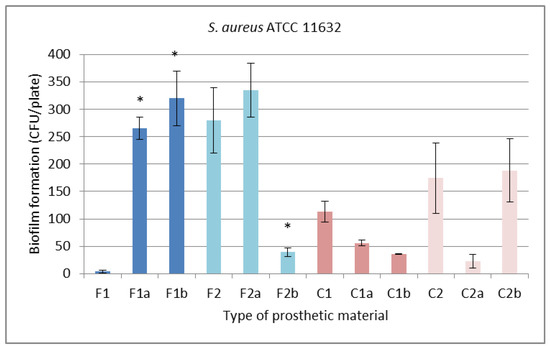 Biofilm formation of Staphylococcus aureus ATCC 11632 on different zirconia samples. The error bars indicate standard deviations. The data were presented as the mean ± SD of two replicates. * = p ≤ 0.05. F1—zirconia veneered and polished samples; F1a—zirconia veneered and polished samples treated with ultrasonic scaling; F1b—zirconia veneered, polished and brushed samples; F2—zirconia veneered and glazed samples; F2a—zirconia veneered and glazed samples treated with ultrasonic scaling; F2b—zirconia veneered, glazed and brushed samples; C1—zirconia milled and polished samples; C1a—zirconia milled and polished samples treated with ultrasonic scaling; C1b—zirconia milled, polished and brushed samples; C2—zirconia milled and glazed samples; C2a—zirconia milled and glazed samples treated with ultrasonic scaling and C2b—zirconia milled, glazed and brushed samples.