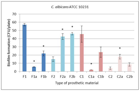 Biofilm formation of Candida albicans ATCC 10556 on different zirconia samples. The error bars indicate standard deviations. The data were presented as the mean ± SD of two replicates. * = p ≤ 0.05. F1—zirconia veneered and polished samples; F1a—zirconia veneered and polished samples treated with ultrasonic scaling; F1b—zirconia veneered, polished and brushed samples; F2—zirconia veneered and glazed samples; F2a—zirconia veneered and glazed samples treated with ultrasonic scaling; F2b—zirconia veneered, glazed and brushed samples; C1—zirconia milled and polished samples; C1a—zirconia milled and polished samples treated with ultrasonic scaling; C1b—zirconia milled, polished and brushed samples; C2—zirconia milled and glazed samples; C2a—zirconia milled and glazed samples treated with ultrasonic scaling and C2b—zirconia milled, glazed and brushed samples.