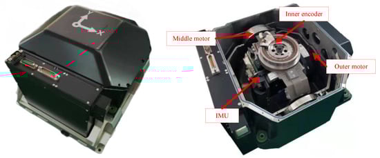 As we can see from Figure 1, there are three orthogonal rotational gimbals inside the tri-axis RINS, which point to the azimuth, pitch, and rolling directions, respectively. On each side of each gimbal, a brushless DC motor and a high-precision angle encoder are installed to drive the gimbal to rotate and collect the rotational angles, denoted as . The combination of three gyros and three accelerometers is called the IMU, surrounded by the rotational gimbals and the relative circuit boards. The gyros and the accelerometers are placed approximately orthogonal to each other. The parameters of the relevant sensors are listed in Table 1. It should be explained that a slightly lower accuracy z-gyro can reduce the size of the tri-axis RINS because the higher the accuracy, the larger the fiber ring radius. The study in this manuscript focuses on the system in Figure 1, but the proposed rotation scheme is available for all types of tri-axis RINS with FOG.
