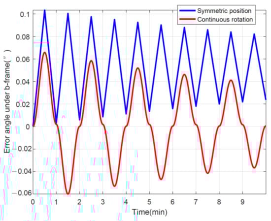 After integrating under the b-frame with time, the error angles can be obtained in Figure 5, and it is obvious that the final remaining cumulative error caused by continuous rotation is smaller than the symmetrical position, indicating that the effect of rotation modulation is better. Certainly, shortening the stopping time can further improve the rotational modulation of the symmetric position, but this is essentially approaching continuous rotation as well. In addition, as for the mean value of the error angle, the error oscillation caused by continuous forward and reverse rotation is double-sided, whereas the symmetrical position is one-sided, which has a larger equivalent error.