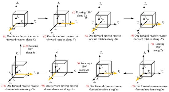 As shown in Figure 6, when the rotational angle of the inner encoder is between 0° and 180°, the IMU completes the forward-reverse-reverse-forward rotation around the middle and outer gimbals. To make the mean value of the coupling error between the z-gyro scale factor error and the rotational angle, the transposition order of the inner gimbal is 0°, 180°, 0°, −180°, and the rotation state of the three gimbals is shown in Figure 7. The rotation angle speed is 6°/s to effectively modulate the errors perpendicular to the rotational axis and dual-axis RINS cannot accomplish the improved rotational modulation scheme.