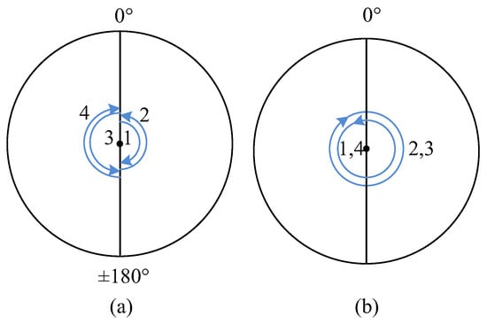 We denote continuous forward and reverse rotation around the azimuth axis as Scheme A, the conventional 16-position stop as Scheme B, and the improved rotational modulation scheme proposed in this manuscript as Scheme C. To facilitate the analysis, the rotation angular velocity of all schemes in this manuscript is set to and the stopping time at each position of Scheme B is . When the angular velocity of rotation is , the time to complete a 360° rotation is . The periods of the three schemes are , and . A simple diagram of the 16-position stop scheme is shown in Figure 8.