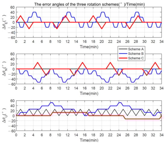 To be more visual, a simple numerical calculation is made below. We assume that the gyro scale factor error is 20 ppm and the installation error is 10″. Then, when , the error angles caused by the scale factor errors and the installation errors of FOG in the geographic system are plotted in Figure 9, and the average values of the three rotation schemes are , and . For example, for a 12-h navigation test, 25.92″ corresponds to a drift of about and such an error would cover the advantage of Scheme B, especially for RINS with FOG.