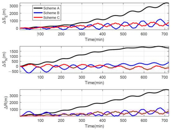 Under the same initial alignment conditions and navigation environment, we obtained the following navigation results: The position errors of the three schemes for a certain navigation test were plotted in Figure 13, and it is obvious that Scheme C has the smallest position error.