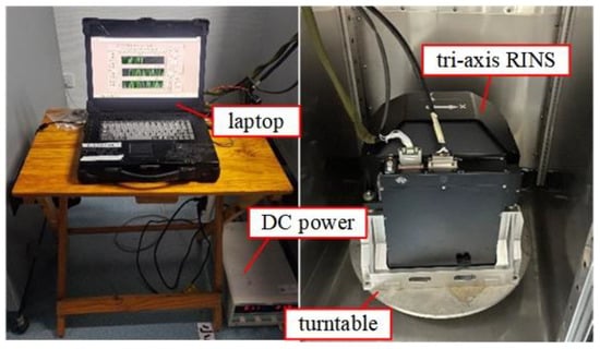 Since this manuscript mainly demonstrates the advantages of the improved rotational modulation scheme, there is no strict requirement on the initial attitudes and heading angle of RINS, and it is enough to ensure that the turntable is locked during the static navigation experiments. The model of initial alignment and the rotation scheme during alignment were the same, so we mainly focused on the effect of the rotation schemes on navigation accuracy. The navigation time of each test is more than 6 h because more than 1/4 of the Earth’s cycle is convenient to observe the error pattern.
