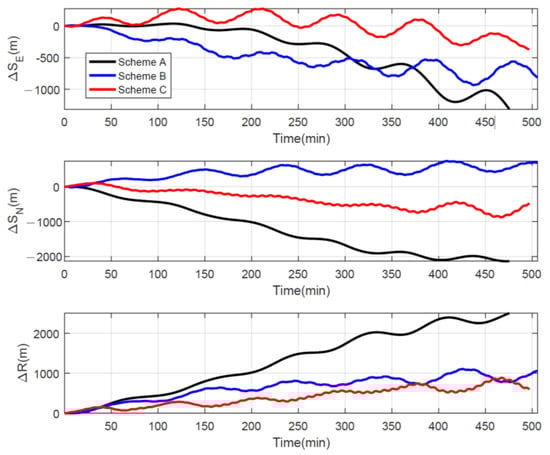 Maximum radial position errors during 6 h navigation of the three schemes.