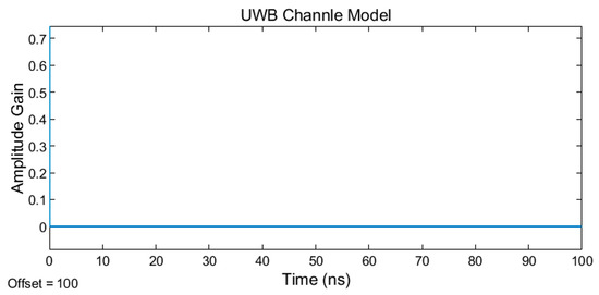 UWB channels are divided into four types according to four typical channel conditions, CM1, CM2, CM3, and CM4, as shown in Table 2. Figure 3 shows the UWB transmitting signal, and Figure 4, Figure 5, Figure 6 and Figure 7 show receiving signal among CM1~CM4 channels, respectively, in which the Y-axis represents the amplitude of the normalized UWB signal. The amplitude gain can be calculated as