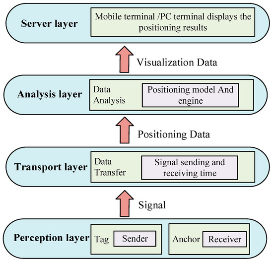 In this study, the functional structure of the UWB positioning system is designed, as shown in Figure 9. The architecture of a complete positioning system in a workshop can be divided into four layers, perception, transport, analysis, and service, as shown in Figure 10. Each layer plays a relatively independent role in the positioning system. The perception layer is the sensing process of UWB signal sending to receiving. Before the base station communicates with the label, the respective parameters need to be configured to guarantee desired positioning results. The transmission layer is data transmission between the base station and the server, which can be realized through the wire, the base station and PC are connected to the transport layer and the service layer. The service layer includes a UWB location server, which visualizes the resolved location data through UWB location engine software.