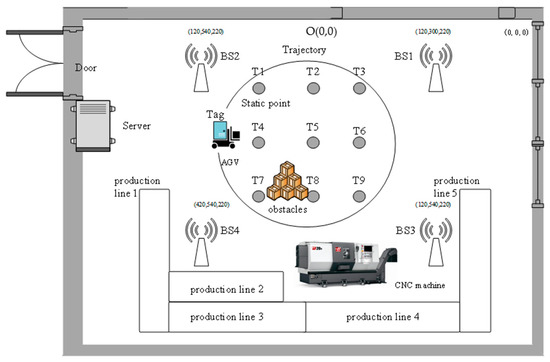 Positioning error challenges exist in current intelligent manufacturing workshops. The location and trajectory information of each production element in the intelligent manufacturing workshop is basic for transparent production and the intelligent manufacturing operation control center. When UWB indoor positioning is carried out in an intelligent manufacturing workshop, there are many factors affecting the positioning results: (1) equipment. The number and location of UWB positioning devices can affect their positioning accuracy. (2) Occlusion. This can occur during the propagation of UWB positioning signals between base stations, and tag, refraction, diffraction, and other phenomena can occur when they are blocked by indoor objects, which will change the amplitude and phase of the signal and then produce positioning errors. (3) Time. The crystal oscillator frequency of each base station usually has a certain deviation due to the manufacturing process and its use in the experiment. (4) Environment. The state of the atmosphere at different times (temperature, pressure, humidity, etc.) can affect the propagation speed of UWB signal waves. (5) Software delay. When the processor analyzes the obtained data information, the software can delay, causing poor real-time positioning. (6) Moving the object with the UWB tag. When the UWB positioning tag is fixed on a moving object, an AGV, or worn by a worker, it is inevitable that shaking occurs during movement, resulting in a deviation in signal transmission [11,12].