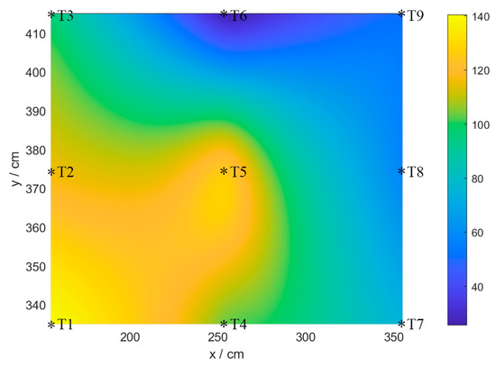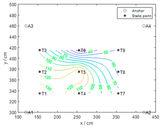 To validate the dynamic error-propagation model proposed above, four base stations (as shown in Table 3), marked as BS1, BS2, BS3, and BS4, are set up in a 10 m × 10 m area (humidity 67%, temperature 15 °C, pressure 100 kph in the current environment) as shown in Figure 11. The base station IDs, respectively, are BS1:00003109, BS2:0000313f, BS3:000030f2, and BS4:000030f. The coordinates of the base station are BS1 (120,300,220), BS2 (420,300,220), BS3 (120,540,220), and BS4 (420,540,220). The unit is cm, with the lower corner of the right front as the origin of coordinates O (0,0) in the signal coverage area, calibrating UWB-Tag position at nine static points (T1, T2, …T9). Coordinate information is provided in Table 4.