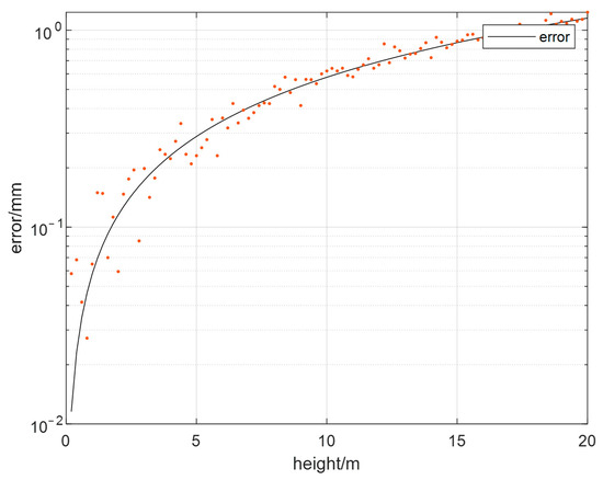 where α denotes the coefficient of air expansion. According to the experimental description in the literature [44], under environmental conditions of temperature = 21 °C, relative humidity = 71%, and atmospheric pressure = 101.325 kPa, the error caused by the atmospheric refractive index can be calculated approximately at the centimeters level and increases with the observation distance.