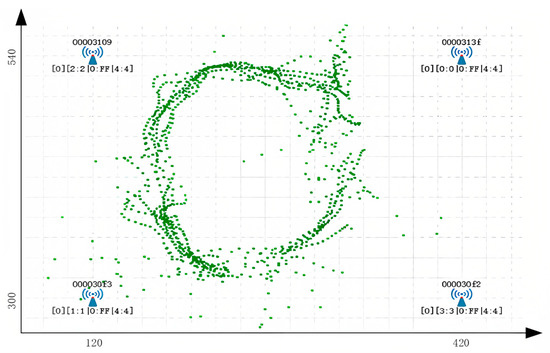 In the area covered by the signal, the UWB tag is fixed on an AGV on a production line in an intelligent manufacturing lab in Figure 11. The ID of the tag is DAF3, and the distance of the automatic guided vehicles (AGV) is set at 10 m. The positioning results of the trolley after walking are shown in Figure 17. Interference from various metal obstacles and the walking of stuff or movement of AGV demonstrated a significant impact on positioning accuracy. The maximum deviation was 1.6 m.