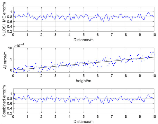 The multipath effect (ME), and non-line-of-sight interference (NLOSI) in Figure 18 were obtained by MATLAB calculation based on the measured data in an experiment. The atmospheric interference (AI) was obtained by MATLAB simulation according to reference [46]. The three errors were accumulated and summed based on variable weights, and the total error is calculated according to Equation (21).