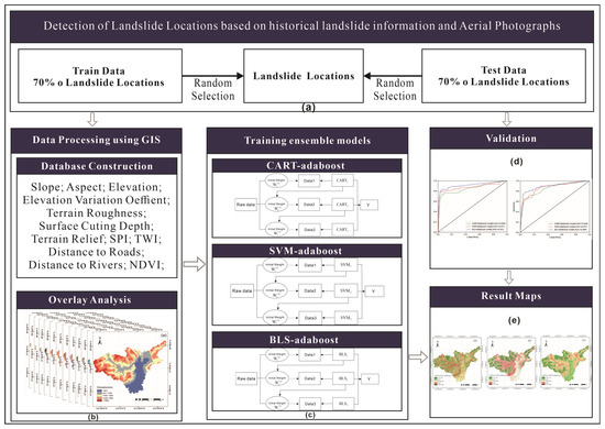 Workflow of the methodology in this study. (a) Determine the location of the landslide; (b) data processing; (c) model training; (d) model evaluation; (e) Mapping landslide susceptibility.
