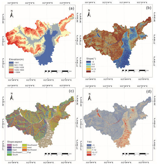 Elevation has been identified as one of the primary factors affecting landslides. Higher elevations generally correspond to steeper slopes and less vegetation cover, leading to higher rates of erosion and greater susceptibility to landslides [32,33]. Elevation was classified into five categories 695–941 m, 941–1193 m, 1193–1416 m, 1416–1664 m and 1664–2685 m.
