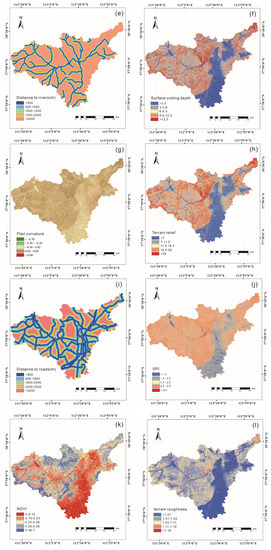 The selection of the influencing factors is crucial for evaluating landslide susceptibility [30]. The selected factors directly affect the competitiveness of the model. However, there is no general standard or guideline on how to select appropriate control variables [31]. In this study, considering previous research, and the geological and environmental characteristics, 12 landslide conditioning factors were selected to assess the landslide susceptibility. These landslide conditioning factors can be divided into three categories. The first category reflects the geological and environmental conditions, including the normalized difference vegetation index (NDVI) and the distance to rivers. The second category reflects the topographic and geomorphic conditions, including the elevation, slope aspect, slope angle, plan curvature, stream power index (SPI), topographic wetness index (TWI), terrain roughness index, terrain relief and surface cutting depth. The third category reflects human activity, namely the distance to ·roads. Each landslide conditioning factor was processed from the available data, and the final output was a raster image with a resolution of 30 m × 30 m. All the landslide conditioning factors used in this study are presented in Figure 3. The raw remote sensing images were subjected to radiometric calibration, atmospheric correction and fusion using ENVI 5.3 software to generate usable images. The calculation of the TWI, SPI, surface cutting depth and terrain relief involved the utilization of the raster calculator. Moreover, the distances from roads and water were derived using the buffer function. Other factors were acquired directly through the respective tools provided by ArcGIS.