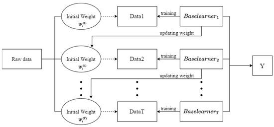 AdaBoost is widely recognized as one of the most renowned boosting algorithms [48]. It is an ensemble method based on a linear superposition model. The input data, , are first fed into a base learner for classification, where misclassified data are given a larger weight and correctly classified data are given a smaller weight. The input data are then rowed according to the weights obtained and fed into the next base learner. The reason for this is to give more attention to the misclassified data in the next prediction. This process is repeated until a certain number of base learners have been obtained. Finally, the predictions of all base learners are combined as a linear superposition of model instances, weighted according to their effect on the training set. All base learners involved in the training and prediction process should predict better than random guesses based on the training set. Figure 6 provides an illustration of the aforementioned process.