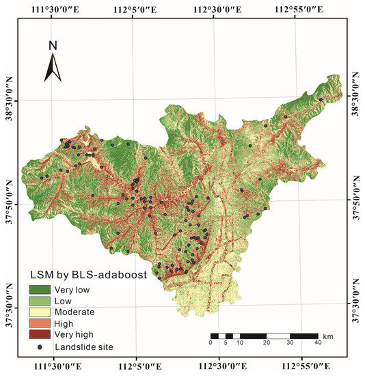 After determining the landslide conditioning factors for predicting landslides, the next step was to create a landslide susceptibility map using the following three steps. Firstly, the values of each conditioning factor were reflected in the pixel values of the study area. The study area was transformed into pixels to serve as input for the prediction of landslides. Secondly, models were constructed using the prepared training data, and these models were applied to predict the landslide susceptibility for the entire study area. The results predicted by the models were considered to be the landslide susceptibility index. Lastly, the LSI values for the entire study area were input into ArcGIS to generate the landslide susceptibility maps. In this study, three ensemble learning models were utilized for mapping landslide susceptibility: CAET-AdaBoost (the adaptive boosting model with CART-based learners), SVM-AdaBoost (the adaptive boosting model with SVM-based learners) and BLS-AdaBoost (the adaptive boosting model with BLS-based learning). The LSI values predicted by the three integrated learning models were categorized into five classes (very low, low, moderate, high and very high) using the natural break method. The BLS-AdaBoost model resulted (Figure 7) in very low (20.5%), low (19.1%), moderate (19.9%), high (22.1%) and very high (18.5%) landslide susceptibility classes. The SVM-AdaBoost model resulted (Figure 8) in very low (18.3%), low (22.1%), moderate (19.3%), high (23.2%) and very high (17.1%) landslide susceptibility classes. The CART-AdaBoost model resulted (Figure 9) in very low (14.0%), low (32.6%), moderate (29.3%), high (15.8%) and very high (8.2%) landslide susceptibility classes.