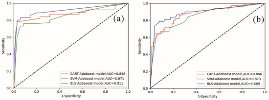 The results of ROC-AUC, as another evaluation method, are displayed in Figure 10. The ROC curves of the CART-AdaBoost model, the SVM-AdaBoost model and the BLS-AdaBoost model for the validation dataset are represented by green, red and blue, respectively. BLS-AdaBoost (AUC = 0.889) had the highest AUC value among the three ensemble models, followed by SVM-AdaBoost (AUC = 0.873) and CART-AdaBoost (AUC = 0.846).