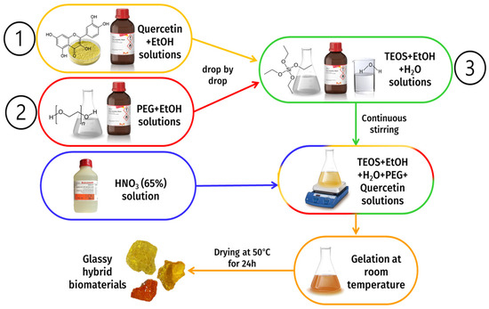 Synthesis of the hybrid materials. (1) quercetin-based (from 5 to 20 wt% with respect to the silica content); (2) polyethylene glycol-based sols (from 6 to 50 wt% with respect to the silica content); (3) TEOS-based sols to be mixed with sols 1 and 2.