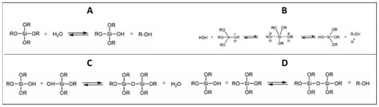 Sol–gel reaction mechanism when the precursor is TEOS (R= -CH2CH3). (A) Hydrolysis reaction; (B) acid-catalyzed hydrolysis reaction with SN2 mechanism; (C) water condensation; and (D) alcohol condensation.