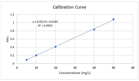 The calibration curve, reported in Figure 3, was obtained by measuring the absorbance of standards made in the SBF and establishing a correlation between solution concentrations and absorbance at a length of 299.0 nm, with R2 = 0.9992. The upper limit was at 50.0 mg/L, while the lower limit was at 5.0 mg/L.