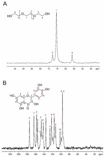 Figure 6A shows the 1H-13C CP-MAS NMR spectrum of P used in this work, showing three peaks at δ 72.8, δ 70.5, and δ 61.2, attributable to HOCH2CH2, to the backbone ether carbons, and to HOCH2CH2, respectively. The FWMH of the peaks is ca. 49 Hz, and their integrals are 2:13.4:2, consistent with the mean molecular weight of 400 da. The 1H-13C CP-MAS NMR spectra of the hybrid systems composed of S, P, and Q show, together with peaks attributable to P, signals at ca. δ 165, δ 58.3, and δ 14.5, attributable to the aerobic oxidation products of quercetin, Qox, whose antioxidant properties have been recently explored by Speisky et al. [40,58]. The 1H-13C CP-MAS NMR spectrum of pure (not oxidized) quercetin is reported in Figure 6B, for comparison.