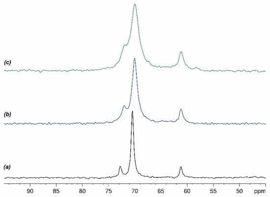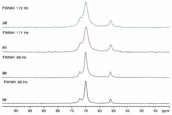 It is apparent that SP50Q20 exhibits 13C NMR peaks that are slightly high-field-shifted (δ 71.8, δ 69.9 and δ 61.1) and that the peak due to the backbone carbons shows a larger FWMH (ca. 172 Hz), with respect to pure P. Such features can be attributed to weak interactions between P and SiO2 and/or Qox. The 1H-13C CP-MAS NMR spectrum of the composite made up of SiO2 and polyethylene glycol confirms the S and P interactions since a similar peak shift, as observed in SP50Q20, is recorded. However, a weak interaction of Qox cannot be excluded given that the broadness of the 13C NMR peaks in the SP50Q20 sample is larger than that of the SP50 composite (ca. 110 Hz). In order to gain insights into the effect of Qox charge onto the broadness of the P 13C NMR peaks, we prepared hybrid systems containing 5% (SP50Q5), 10% (SP50Q10), and 15% (SP50Q15) of quercetin and recorded their 1H-13C CP-MAS NMR spectra (Figure 9a–d), from which it appears that a higher amount of quercetin results in a larger FWMH.