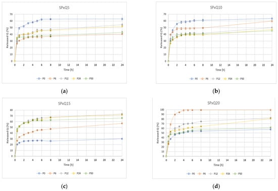 Release of quercetin in function of the P percentage and with (a) 5 wt% of Q, (b) 10 wt% of Q, (c) 15 wt% of Q, and (d) 20 wt% of Q.