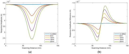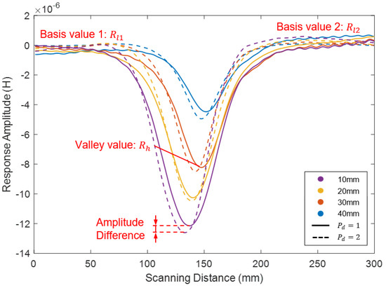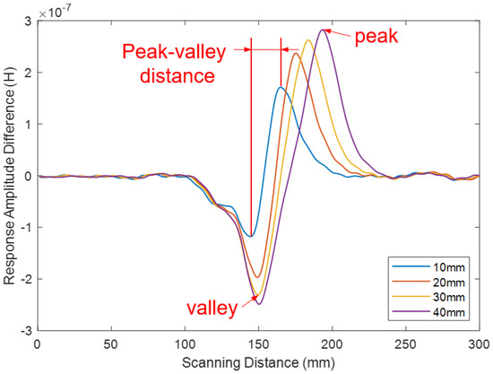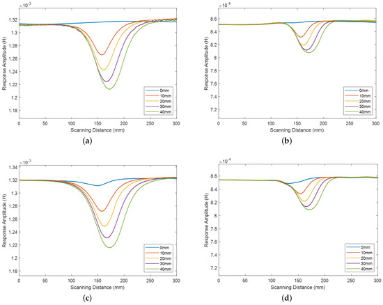 This section focuses on analyzing the influence of the flaw position on the response amplitude. As depicted in Figure 8, the response peaks of flaws are affected by both the flaws and basic response drifts. To accurately quantify the response amplitude, the underlying response drifts need to be eliminated. In the experiment, the response obtained under “no defect” conditions served as the baseline value for identifying the basic coil response drifts during scanning. Compensated responses were obtained by subtracting the essential drift value. Figure 15 shows the offset response values of flaws with different lengths at 2500 Hz excitation under and , where the baseline is located nearby the zero line. The basis values and were obtained by averaging the baseline values on either side of the peak value to minimize the influence of fluctuations. Based on the compensated response values, the absolute response amplitude was calculated ulteriorly using this formula: